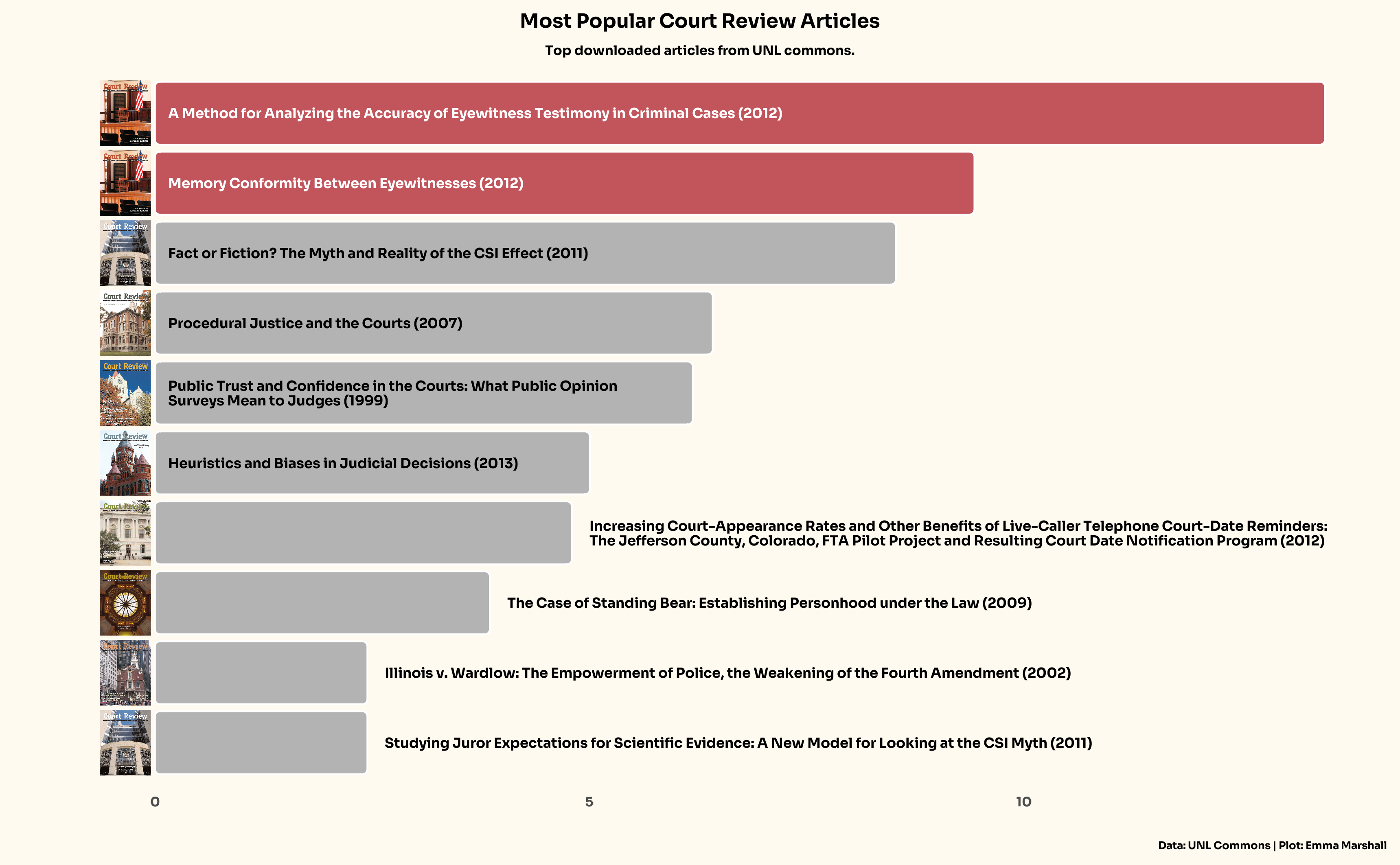 Making bar charts with data from the most popular Court Review articles.